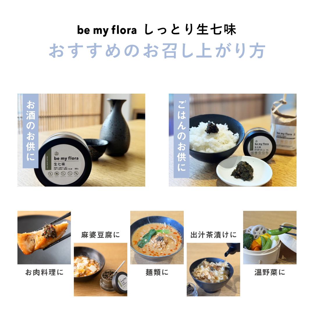 ごまの香ばしさ、口の中で広がる風味とともに追いかけてくる旨味が食欲をそそり、ごはんのお供にぴったり。be my flora kitchenでは、生七味のおにぎり(テイクアウト)も販売しています。