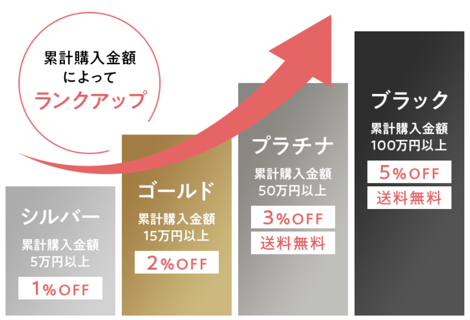 会員ランクが上がるほど、ご購入時の割引率や送料優待などの特典が、より充実した内容へとグレードアップいたします。