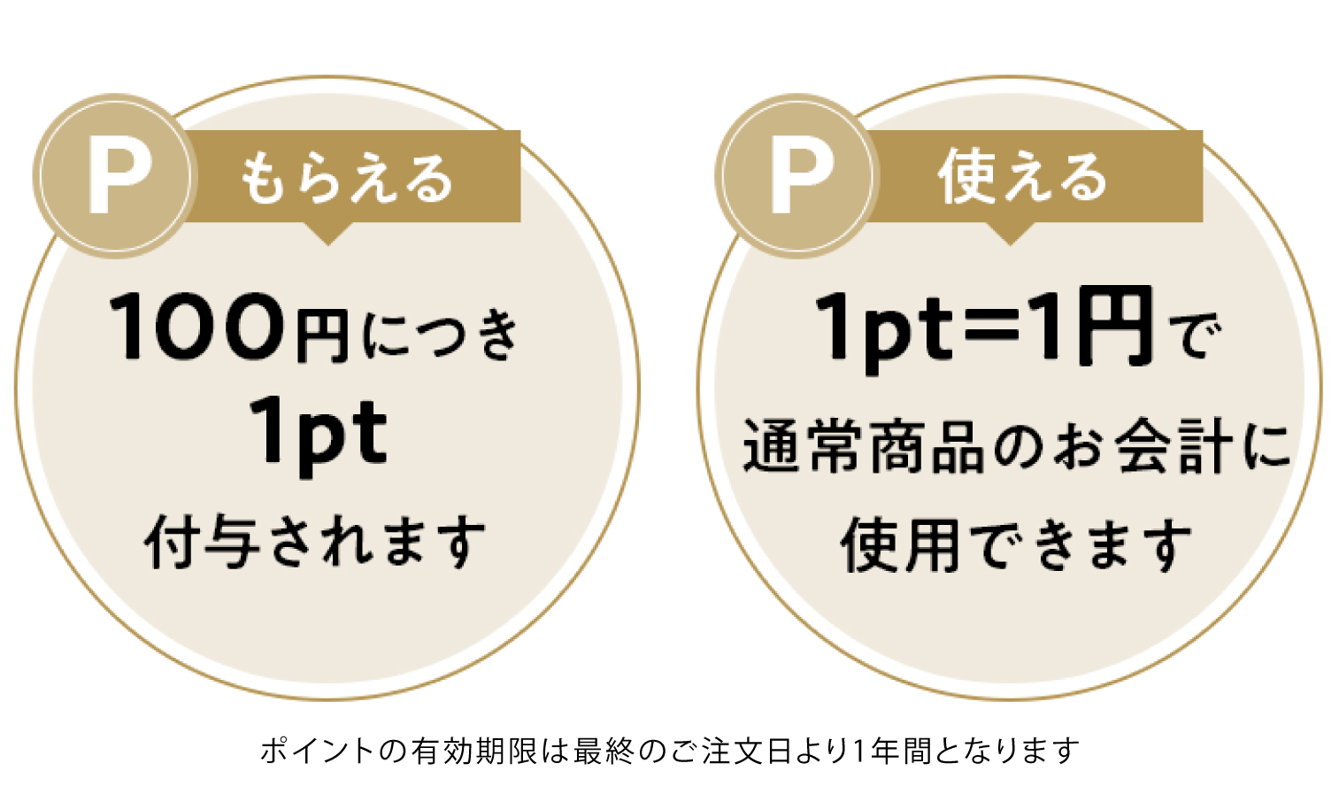 お買い物ごとに、次回以降のご注文でお使いいただけるポイントが貯まります。ポイントは1ポイント1円として、ご注文時に利用することができます。