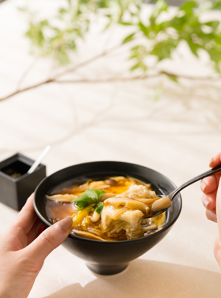 洗練された外観でありながらも、店内は開放的で明るく、天然木ならではの温もりを感じられる心地よいインテリア。本物の木を使用した大きなカウンターテーブルは、お一人の方も落ち着いてお食事が可能。格子で仕切られた半個室では、大切な方々と楽しいひと時をお過ごしいただけます。